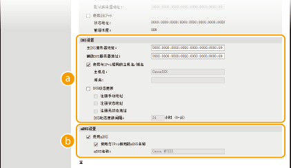 2 | 配置 IPv6 DNS 设置。 必须选择 [使用IPv6] 复选框才能配置设置。设置 IPv6 地址 ![]() [DNS设置][主DNS服务器地址] 输入 DNS 服务器的 IP 地址。无法输入以“ff”开头的地址(或多路传送地址)。 [辅助DNS服务器地址] 如果有辅助 DNS 服务器,请输入其 IP 地址。无法输入以“ff”开头的地址(或多路传送地址)。 [使用与IPv4相同的主机名/域名] 选中此复选框可使用与 IPv4 中相同的主机名和域名。 [主机名] 为要注册到 DNS 服务器的本机主机名输入最多 47 个字母数字字符。 [域名] 为本机所属的域名输入最多 47 个字母数字字符,例如“example.com”。 [DNS动态更新] 选中此复选框可在本机的 IP 地址更改时动态更新 DNS 记录。若要指定想要注册到 DNS 服务器的地址类型,请选中 [注册手动地址]、[注册状态地址] 或 [注册无状态地址] 复选框。若要指定更新间隔,请在 [DNS动态更新间隔] 文本框中以小时为单位输入时间。 [mDNS设置][使用mDNS] mDNS(多路传送 DNS)是用于不通过 DNS 将主机名与 IP 地址相关联的协议,Bonjour 采用的就是该协议。选择此复选框可启用 mDNS。 [使用与IPv4相同的mDNS名称] 选中此复选框可使用与 IPv4 中相同的 mDNS 名称。若要设置不同名称,请清除此复选框,然后在 [mDNS名称] 文本框中输入 mDNS 名称。 |
