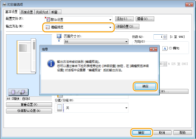 显示打印机驱动程序的打印设置画面。可用设置比使用普通打印方法时的设置更少。