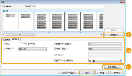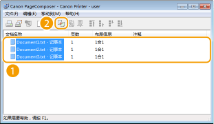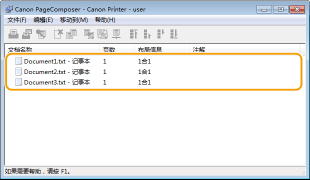 通过使用 Canon PageComposer,可以将多个文档合并为一个打印作业,并以指定的打印设置打印此作业。例如,此功能可以用来合并使用不同应用程序制作的文档并以相同的纸张尺寸打印所有页面。