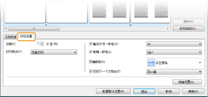 单击 [打印设置] 选项卡显示用来指定份数或单面/双面打印等打印设置的画面。此处指定的设置将应用于整个打印作业。