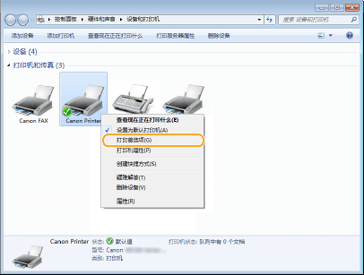 右击本机的打印机驱动程序图标,然后单击 [打印首选项]。