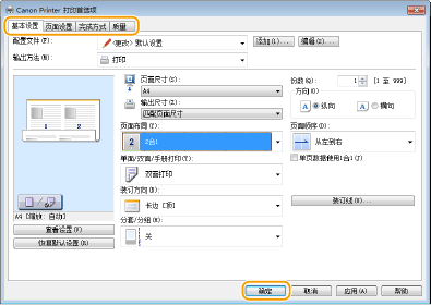 单击 [基本设置]、[页面设置]、[完成方式] 或 [质量] 选项卡,根据需要在各画面上指定打印设置。各种打印设置