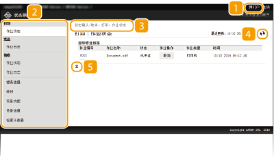 显示当前打印文档状态以及打印、复印、发送和接收文档的历史记录。也可查看本机状态。
