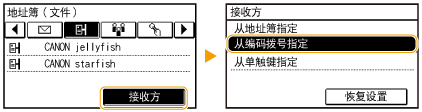 ![]() | 三位数的数字(编码拨号号码)将被分配到地址薄中的地址。也可以通过输入其编码拨号号码来指定地址。 |