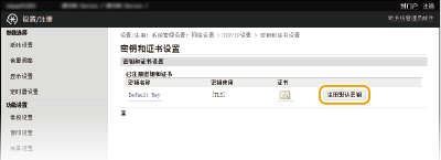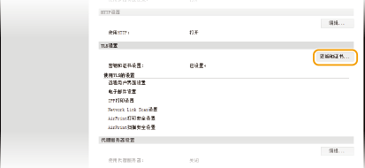 您可以通过传输层安全性 (TLS) 加密本机和计算机上网页浏览器之间的通信。TLS 是用于加密通过网络发送或接收的数据的机制。当远程用户界面用于指定 IEEE 802.1X 认证 (TTLS/PEAP) 或 SNMPv3 的设置时,必须启用 TLS。若要对远程用户界面使用 TLS,则需要设置密钥对并启用 TLS 功能。启用 TLS 之前请生成或安装用于 TLS 的密钥对(