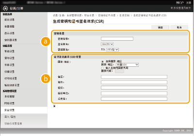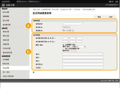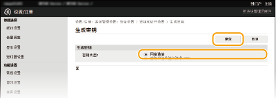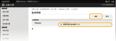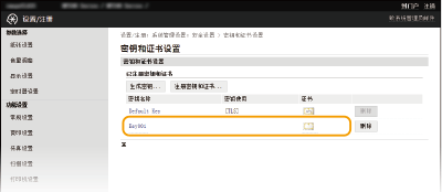 通过传输层安全性 (TLS) 加密通信需要密钥对时,可以使用本机生成。通过远程用户界面访问本机时,可以使用 TLS。最多可以对本机生成五个密钥对(包括预装密钥对)。自签名的证书与“网络通信”中生成的密钥对一起使用。通过“密钥和证书签名请求(CSR)”,可以对本机生成的密钥对应用 CA 颁发的数字证书。