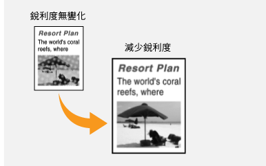 您可以調整影印影像的銳利度。增加銳利度可銳化模糊的文字和線條,降低銳利度可改善雜誌相片的外觀。
