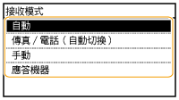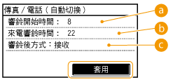 可以將本機設定為在指定時間內來電響鈴時自動接收傳真。切換至自動接收