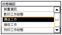 ![]() <傳送工作狀態>/<傳真接收工作狀態>顯示正在傳送、接收或等待處理的文件清單。