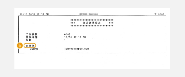 對於電子郵件,傳送結果報表顯示本機和郵件伺服器之間的傳輸結果,而不是本機和接收者位址之間的傳輸結果。即使傳輸失敗,也不會列印三位數字錯誤代碼。若要查看錯誤代碼,請列印通訊管理報表(