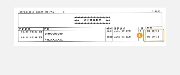 出現錯誤代碼時)。對於電子郵件,通訊管理報表顯示本機和郵件伺服器之間的傳輸結果,而不是本機和接收者位址之間的傳輸結果。