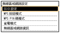 安全設定如果透過選擇無線路由器設定無線連線,則 WEP 認證方法設定為 <開放式系統>,或 WPA/WPA2 加密方法設定為 <自動>(AES-CCMP 或 TKIP)。若要將 WEP 認證選擇為 <共用鍵值>,或將 WPA/WPA2 加密選擇為 <AES-CCMP>,則必須使用手動輸入方法設定連線(指定詳細設定以設定連線)。