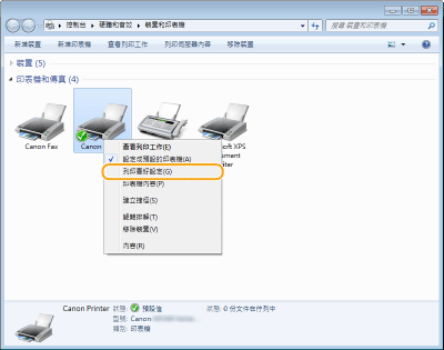在本機的印表機驅動程式圖示上按一下滑鼠右鍵,然後按一下 [列印喜好設定]。