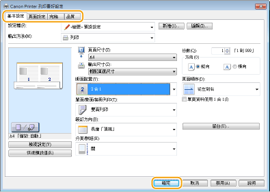 必要時,按一下 [基本設定]、[頁面設定]、[完稿] 或 [品質] 標籤以指定每個畫面上的列印設定。