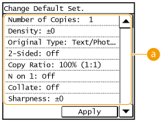 <Menu>  <Copy Settings>  <Change Default Settings>  Select the setting  Change the default value of the selected item  <Apply>  <Apply>