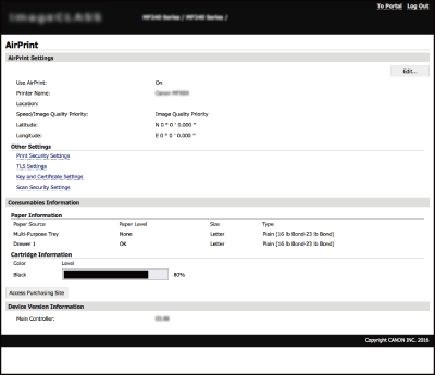 You can display the screen for AirPrint, on which you can not only access the AirPrint Settings but also view information about consumables, such as paper and toner cartridge. Further, you can configure security function settings (