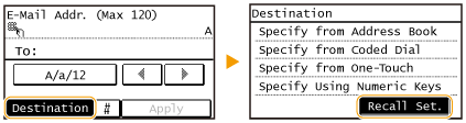 You can select a destination from among the past three destinations. When you specify a previously used destination, the machine also sets the same scan settings such as density you used the last time you sent documents to that destination.
