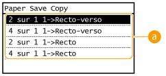 Vous pouvez utiliser <2 sur 1>/<4 sur 1> pour copier plusieurs documents sur une seule feuille et <Recto-verso> pour copier le document sur les deux côtés d'une feuille. <Éco. pap.> dans l'écran d'accueil combine ces fonctions et facilite l'économie de papier par rapport à l'utilisation de l'une ou l'autre de ces fonctions.