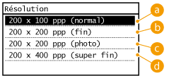 Vous pouvez sélectionner la résolution qui convient au type de document actuel. Plus la résolution est élevée, plus l'image est nette, mais plus la durée de la transmission sera longue.