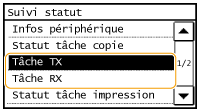 ![]() <Statut des tâches TX>/<Statut tâche RX fax>Affiche la liste des documents envoyés et reçus ou en attente de traitement.