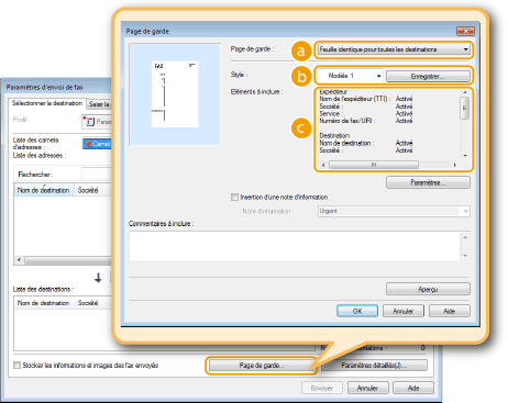 Vous pouvez joindre une page de garde au document que vous envoyez. Sélectionnez une page de garde parmi les trois modèles disponibles dans le pilote de fax ou créez des pages personnalisées. Pour en savoir plus, cliquez sur [Aide], dans l'écran du pilote de fax.
