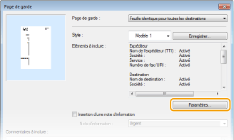 Affiche les éléments à inclure dans une page de garde. Pour les modifier, cliquez sur [Paramètres].