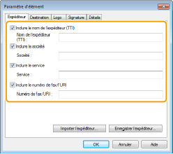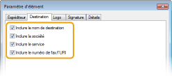 Sélectionnez les éléments relatifs au destinataire que vous souhaitez inclure, puis saisissez les informations. Le nom des destinataires, des entreprises, des services et les numéros de fax indiqués dans l'onglet [Sélectionner la destination]/[Saisir la destination] (