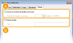 Cochez cette case si vous désirez indiquer, sur la page de garde, le nombre de feuilles que vous êtes sur le point d'envoyer, puis précisez-en le nombre dans [Nombre de feuilles à envoyer ]. Le nombre de feuilles à envoyer n'est pas comptabilisé automatiquement. La valeur que vous indiquez dans ce champ est reportée dans la page de garde.