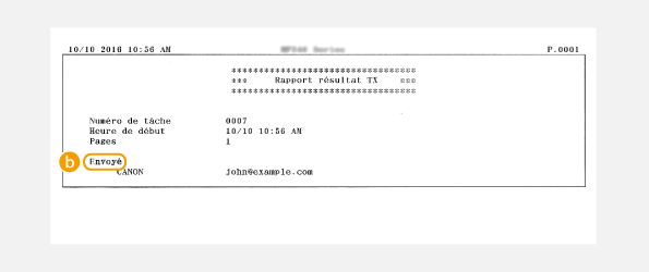 Il est possible de consulter les journaux de fax ou d'e-mails relatifs aux documents envoyés ainsi qu'aux documents enregistrés et placés dans un dossier partagé en imprimant un rapport résultat TX. Il est possible d'imprimer ce rapport à l'issue de chaque transmission ou en cas d'erreur d'envoi.