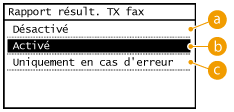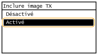 Lorsque vous sélectionnez <Activé> ou <Uniquement en cas d'erreur>, il est possible d'insérer une partie du fax dans le rapport. Appuyez sur <Inclure image TX> pour le régler sur <Activé>.