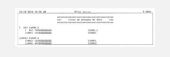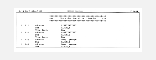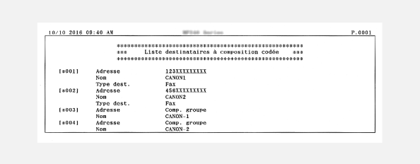 Vous vérifiez la liste des destinataires mémorisés dans le carnet d'adresses à l'aide des options <Composition codée>, <1 touche> et <Comp. groupe> en imprimant la liste du carnet d'adresses.