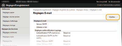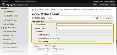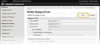 Utilisez l'IU distante pour définir les paramètres détaillés d'envoi, notamment les paramètres d'authentification POP ainsi que le cryptage des communications avant tout envoi d'e-mails. Contactez votre fournisseur ou votre administrateur réseau pour les paramètres requis.