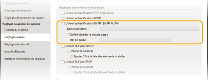 Si vous configurez l'authentification SMTP (AUTH SMTP), l'identification utilisateur par nom et mot de passe s'exécute lors de l'envoi de l'e-mail.
