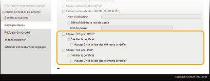 Cochez la case pour utiliser le protocole TLS pour crypter les communications transitant par le serveur SMTP. Cochez la case pour [Vérifier le certificat] ou [Ajouter CN à la liste des éléments à vérifier] en fonction de vos attentes.