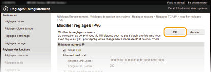 La case [Utiliser IPv6 ] doit être cochée pour configurer les réglages. Définition des adresses IPv6