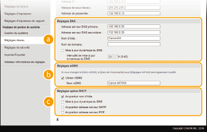 Adopté par Bonjour, le protocole mDNS (multicast DNS) est un protocole associant le nom d'hôte à une adresse IP sans faire intervenir le DNS. Cochez la case pour activer mDNS et saisissez le nom mDNS dans la zone de texte [Nom mDNS ]. [Réglages option DHCP][Acquisition nom d'hôte ]