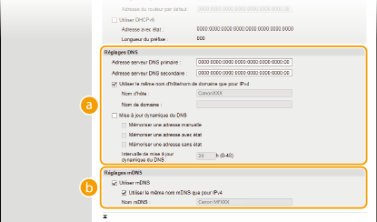 Cochez la case pour mettre à jour de façon dynamique les enregistrements DNS dès qu'une adresse IP de l'appareil change. Pour indiquer le ou les types d'adresses à enregistrer sur le serveur DNS, cochez la case [Mémoriser une adresse manuelle ], [Mémoriser une adresse avec état ] ou [Mémoriser une adresse sans état ]. Pour indiquer le laps de temps entre deux mises à jour, saisissez-le dans la zone de texte [Intervalle de mise à jour dynamique du DNS ]. [Réglages mDNS][Utiliser mDNS ]