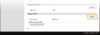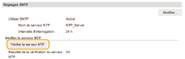 Test des communications avec le serveur NTP/SNTPVous pouvez afficher l'état des communications avec le serveur enregistrer en cliquant sur [Réglages/Enregistrement]
