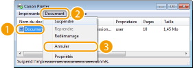 Annulation à partir de l'IU distanteVous pouvez annuler l'impression dans la page [Statut tâche] de l'IU distante : Vérification de l'état actuel des documents d'impression