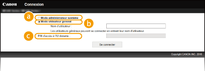 Vous pouvez effectuer toutes les opérations et tous les réglages de l'interface utilisateur distante. Entrez le code PIN approprié dans [PIN administrateur système ] (