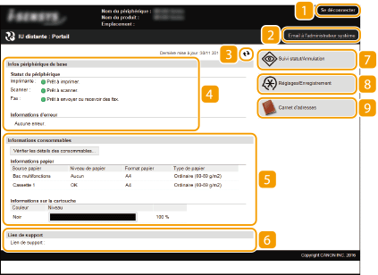Affiche l'état actuel de l'appareil et les informations relatives aux éventuelles erreurs. En cas d'erreur, le lien vers la page d'information sur l'erreur apparaît.