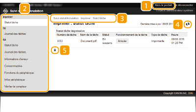 Affiche l'état des documents d'impression courants ainsi que l'historique des documents imprimés, envoyés ou reçus. Vous pouvez également examiner l'état de l'appareil.