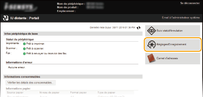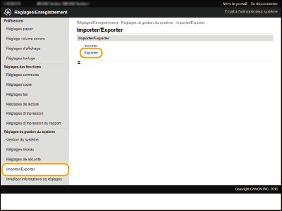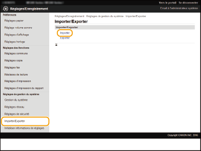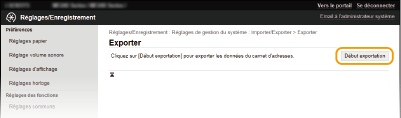Les informations du carnet d'adresses contenues dans l'appareil peuvent être enregistrées dans l'ordinateur (via une exportation). Les données mémorisées au niveau de l'ordinateur peuvent également être enregistrées dans l'appareil (via une importation). Vous pouvez également facilement copier les destinataires dans le carnet d'adresses sur plusieurs appareils.* Pour utiliser ces fonctions, il est nécessaire de se connecter en Mode administrateur système.