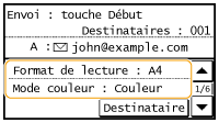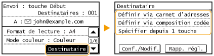 Si vous définissez plusieurs destinataires, le deuxième destinataire et les suivants doivent être enregistrés dans le carnet d'adresses ou sur le serveur LDAP. Vous ne pouvez définir en CC et en CCI que des destinataires enregistrés dans le carnet d'adresses. Pour utiliser le carnet d'adresses, vous devez préalablement exécuter la procédure d'enregistrement.