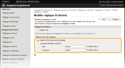 Cochez la case [Utiliser le PIN d'accès à l'IU distante] et configurez le code PIN.