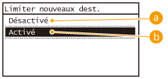 Lorsque cette fonction est activée, l'appareil empêche les utilisateurs de saisir des destinataires à l'aide des touches numériques, d'ajouter de nouvelles entrées au carnet d'adresses et de modifier son contenu actuel. |