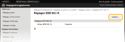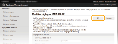Utilisation du panneau de commandeVous pouvez également activer ou désactiver l'authentification IEEE 802.1X à partir de <Menu>, dans l'écran <Accueil>. Réglages IEEE 802.1X