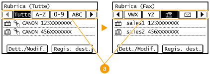 La Rubrica consente di specificare una destinazione selezionandola da un elenco di destinazioni registrate o tramite ricerca per nome delle destinazioni con i nomi dei destinatari.