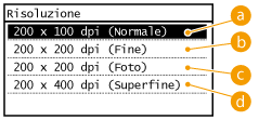 È possibile selezionare la risoluzione adatta al tipo di documento. Il valore della risoluzione è direttamente proporzionale alla nitidezza dell'immagine, ma è richiesto un tempo più lungo per l'invio.