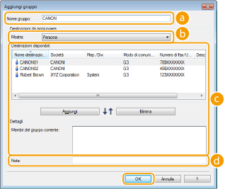 Selezionare le destinazioni da registrare in Selezione gruppo e fare clic su [Aggiungi]. Le destinazioni selezionate vengono visualizzate in [Membri del gruppo corrente].
